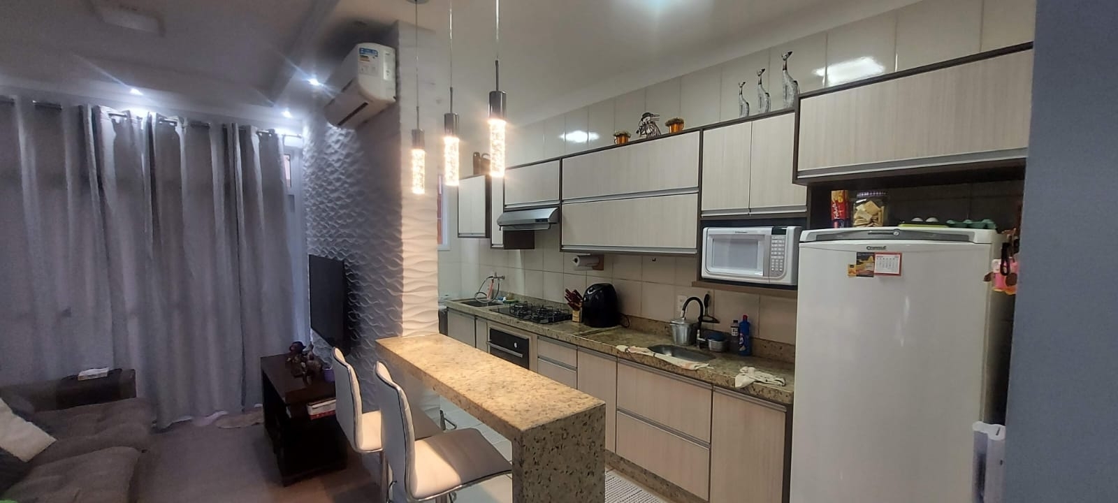 - Apartamento decorado e mobiliado (do jeito que está na foto: geladeira, cooktop, forno, ar condicionado, TV, rack, sofá, mesa de jantar, chuveiro, camas, planejado, máquina de lavar e secar Sansung nova, etc.)