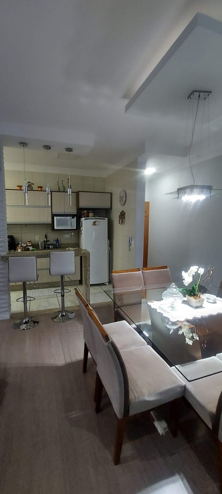 - Sala de jantar com linda mesa com tampo de vidro com cadeiras;