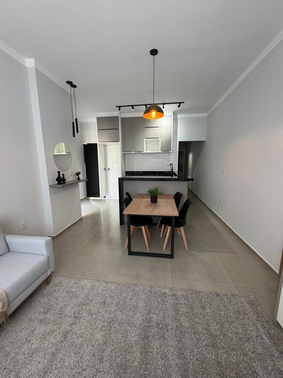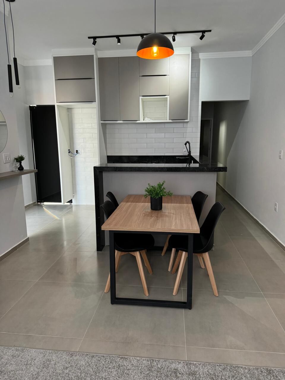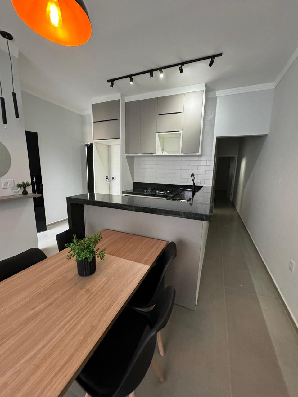 - Cozinha americana com planejado, Cooktop e forno, balcão e mesa de jantar;